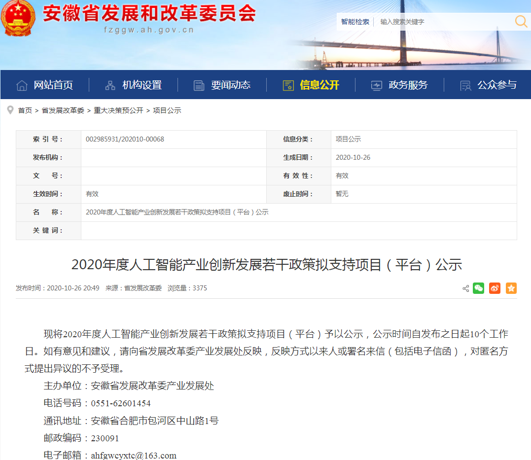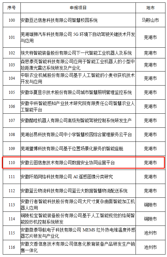 近日,安徽省发展和改革委员会公示了2020年度人工智能产业创新发展若干政策拟支持项目(平台)。tyc1286太阳成集团信息申报的数据安全协同运营平台项目获得该项政策支持,并且顺利通过评选,进入公示阶段!