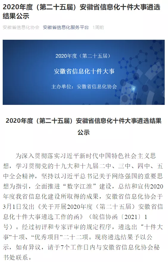 【tyc1286太阳成集团头条】tyc1286太阳成集团信息成功入选2020年度安徽省信息化优秀项目!
