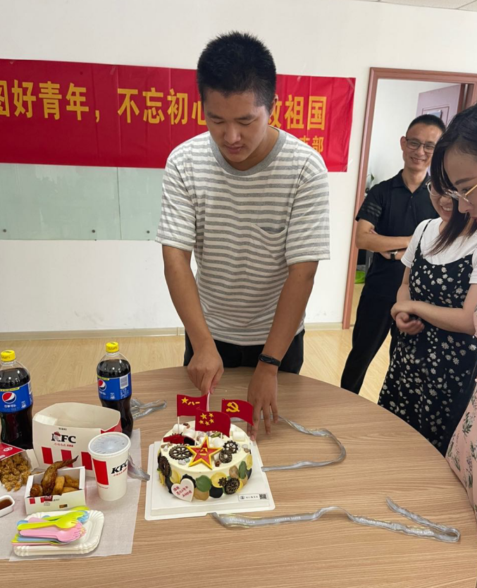 杨扬性格开朗,一直是公司同事心中的“智多星、欢乐果”,同时也是一名名副其实的“小吃货”,支部联合工会委员会职工代表,提前为他的欢送会准备了他爱吃的肯德基、小零食、“快乐肥宅水”和蛋糕。