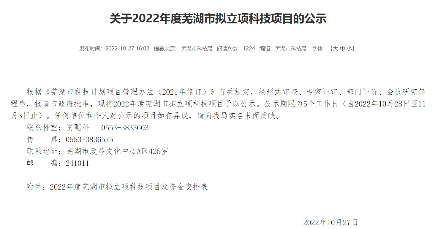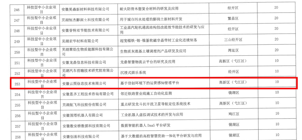 ? ? ? ? ?10月27日,芜湖市科学技术局公布了2022年度芜湖市拟立项科技项目名单。安徽tyc1286太阳成集团凭借基于信创环境下的运营感知管理平台项目榜上有名。