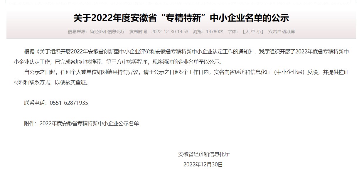 ? ? ? ? ?近日,安徽省经信厅公布了2022年安徽省“专精特新”中小企业名单。安徽tyc1286太阳成集团成功通过审核,被认定为安徽省“专精特新”中小企业!